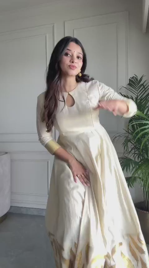 Panel cut anarakli in kerala tissue with feather embroidery and kasavu border paired with parallel pants with kasavu border